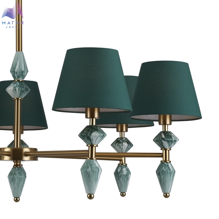 Коллекция светильников Lumion Vermont поражает изысканным керамическим декором, имитирующим малахит. Малахитовая керамика сочетается с зеленым цветом плафонов и и арматурой в благородном латунном цвете.