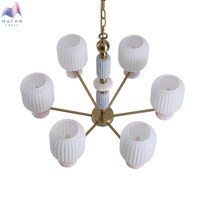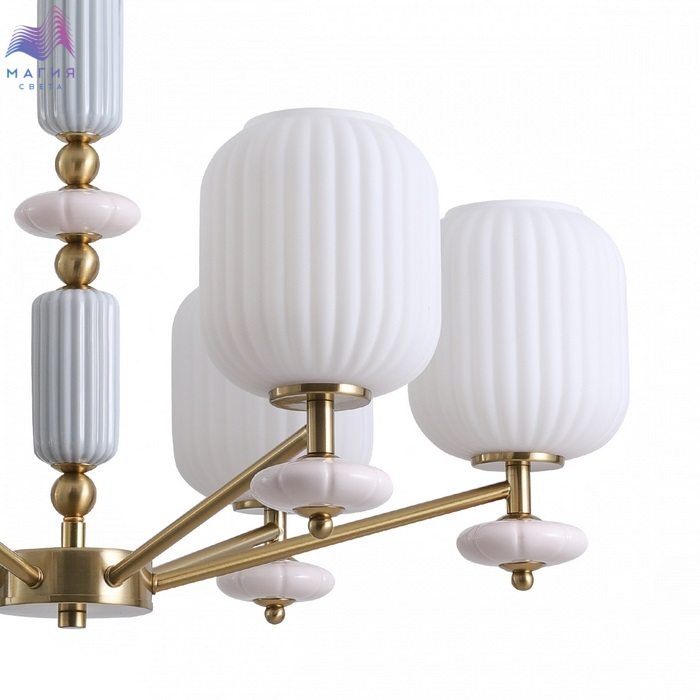 В серии Lumion Alegra соединились белая керамика в форме патисон и серая керамика бочкообразцой формы с ребристой фактурой. Плафоны изготовлены из белого стекла, вторящих по форме серым керамическим элементам. Арматура выкрашена в бронзовый цвет.