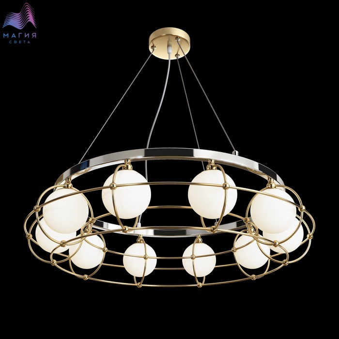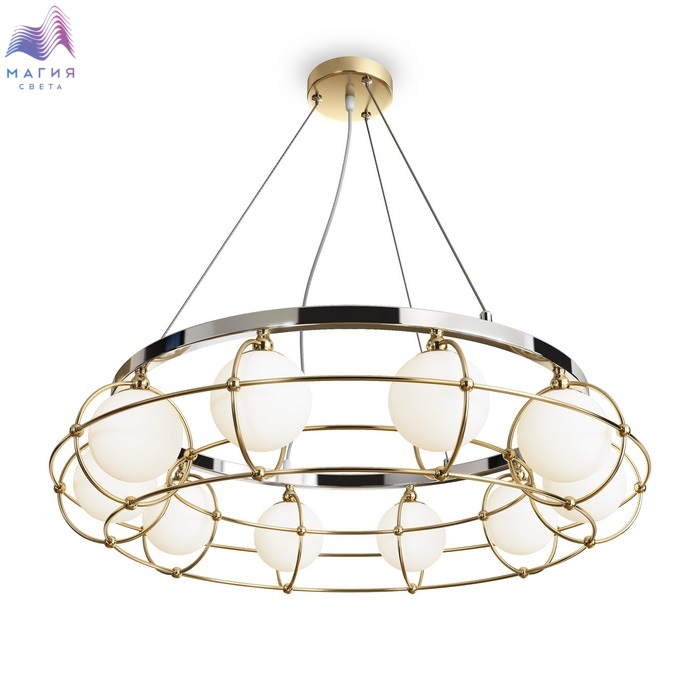 Серия подвесных моделей Maytoni Carcass представлена на 8, 10 и 12 плафонов. Арматура выполнена из комбинации металлов двух цветов: хроме и золоте. Плафоны изготовлены из матового белого стекла в форме шара.