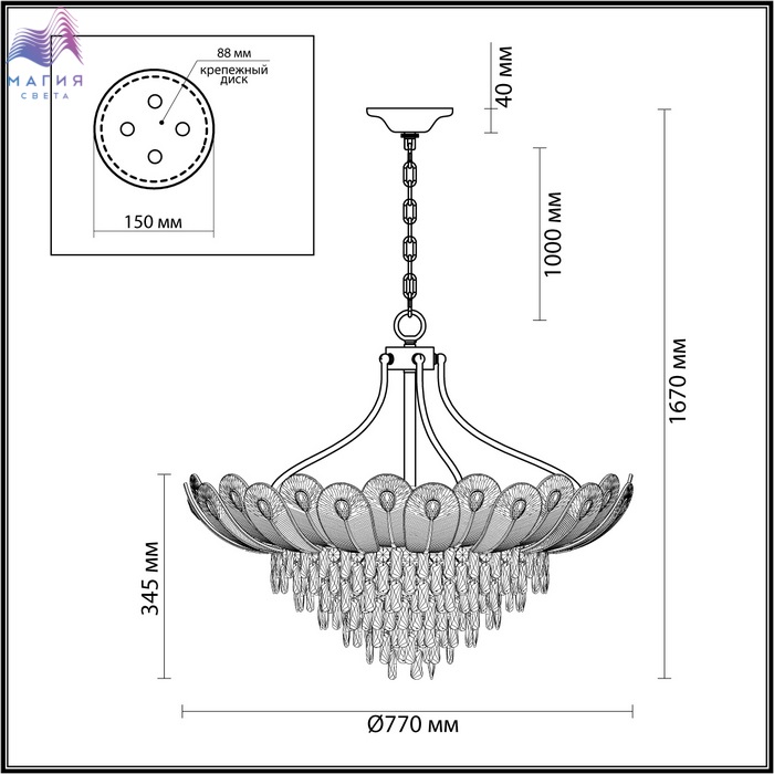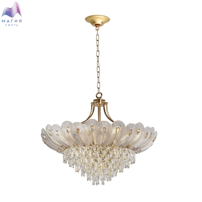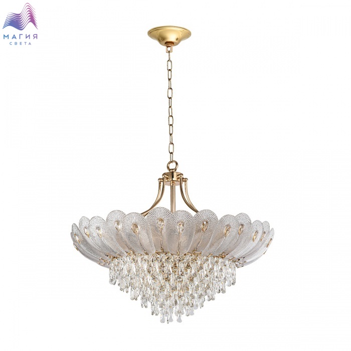 Odeon light Paroti— шикарная линия, вдохновляющая своей красотой. Текстурное стекло в форме пера с каплевидной вставкой из хрусталя и хрустальные подвески крепятся на арматуру цвета глянцевого золота. Линейка представлена двумя потолочными люстрами, бра и люстрой на цепи.