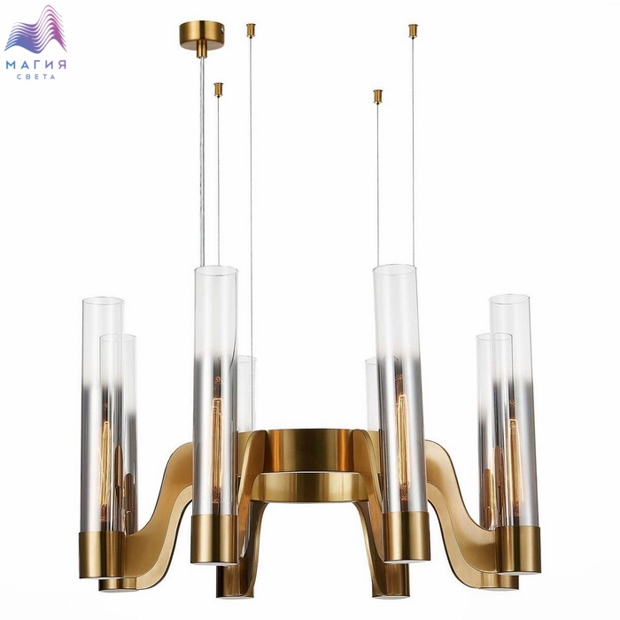 Подвесные люстры из коллекции ST luce Ettore исполнены в современном стиле. Металлическая арматура покрыта латунной краской. На металлическом кольце расположены вытянутые цилиндрические плафоны, изготовленные из стекла. Стекло с эффектом градиента: хром/прозрачный. Длина проводов регулируется при монтаже.