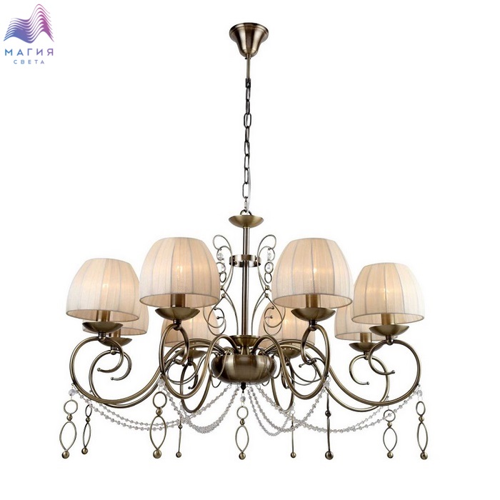 Люстра подвесная 1009/05/08P Stilfort серии Amore - модель, исполненная в классическом стиле. Арматура, изготовленная из металла, представлена в изысканом цвете "античная бронза" и украшена хрустальными декоративными элементами. Тканевые плафоны выполнены в нежном бежевом цвете.