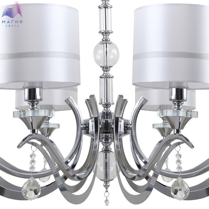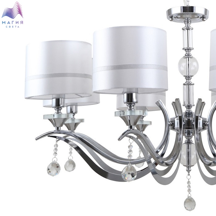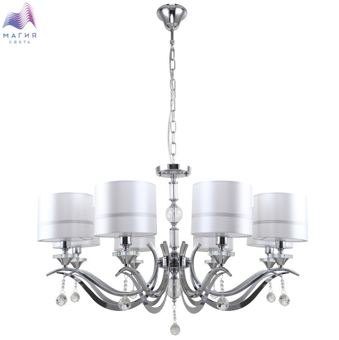 Люстра подвесная 1041/09/08P Stilfort серии Flippe выполнена в классическом стиле. Арматура, изготовленная из хромированного металла, украшена подвесными декоративными элементами. Плафоны выполнены из ткани в белом цвете с серым ободком.