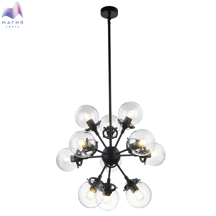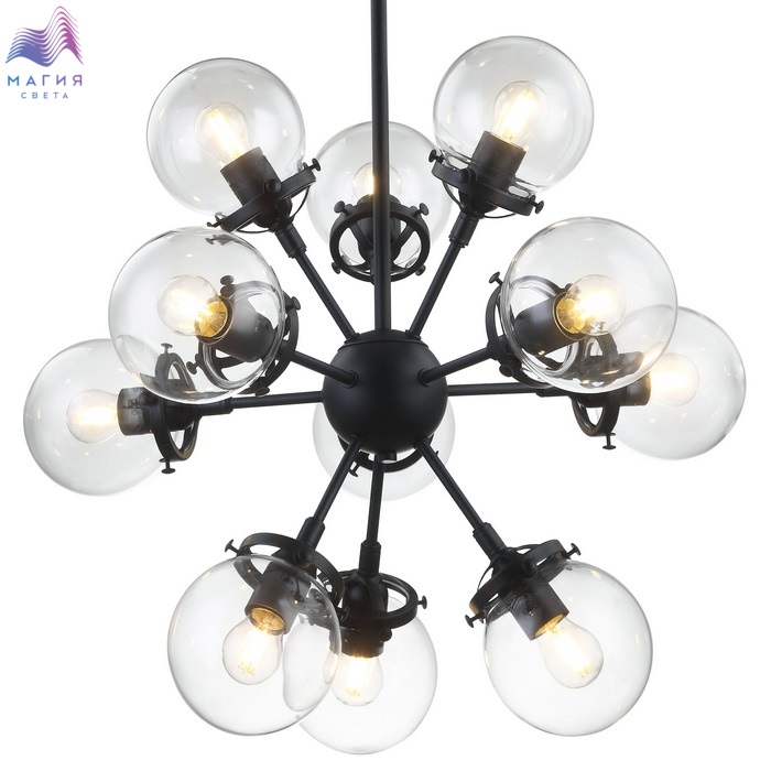 Люстра подвесная 2106/00/11P Stilfort серии Ring - креативная модель в стиле модерн. Арматура изготовлена из металла, полностью в черном цвете. Плафоны люстры стеклянные, прозрачные.