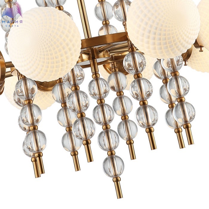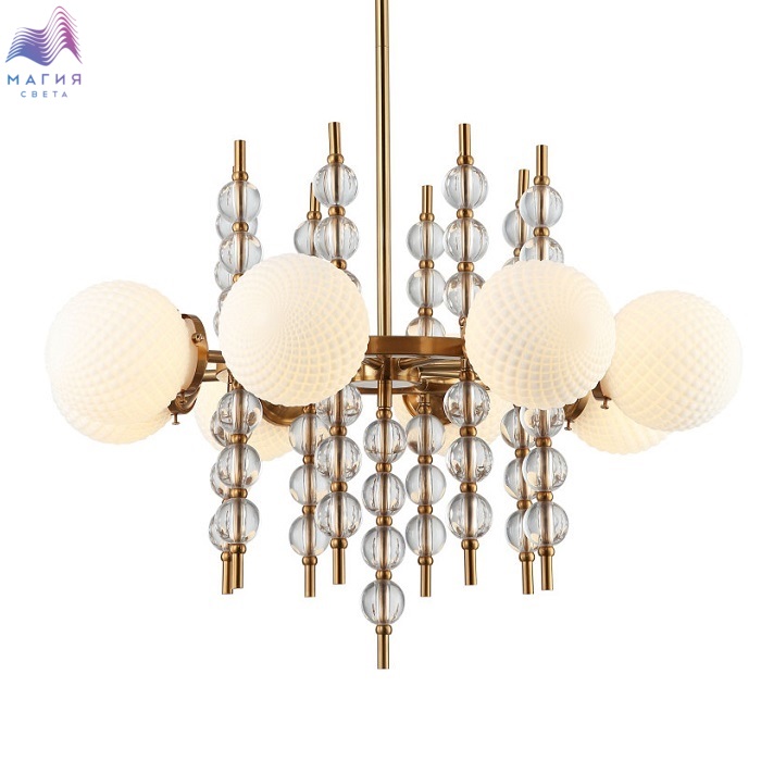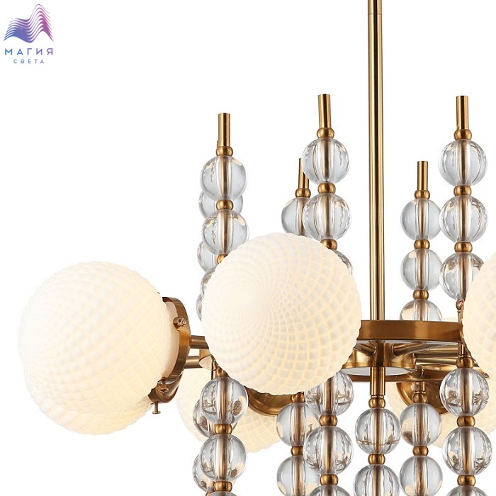 Люстра на штанге 2120/03/08P Stilfort серии Queenly - выполнена в стиле модерн. Арматура изготовлена из метала латунного цвета и украшена стеклянными шарообразными вставками. Плафоны люстры выполнены из стекла в кремовом цвете.