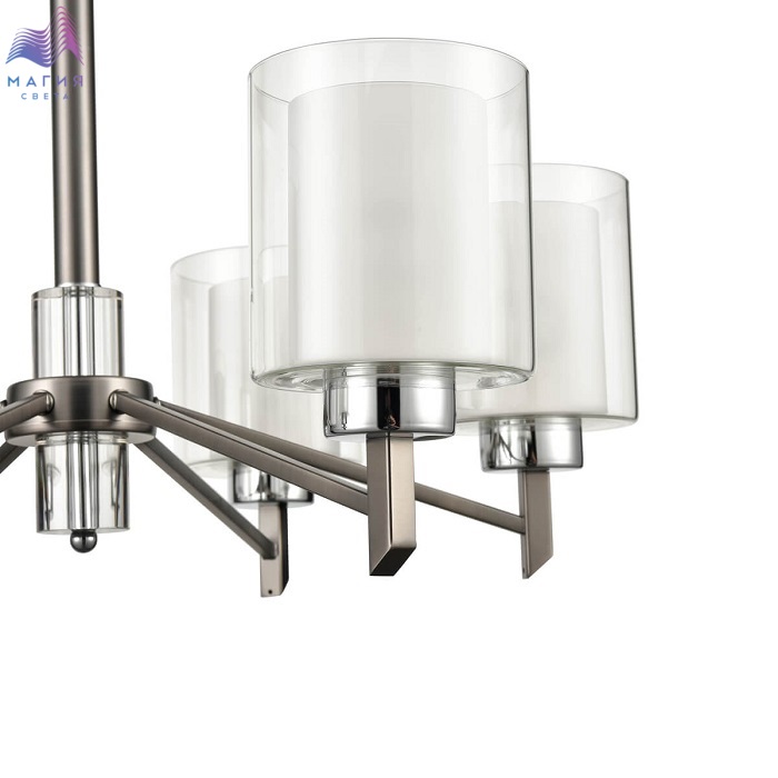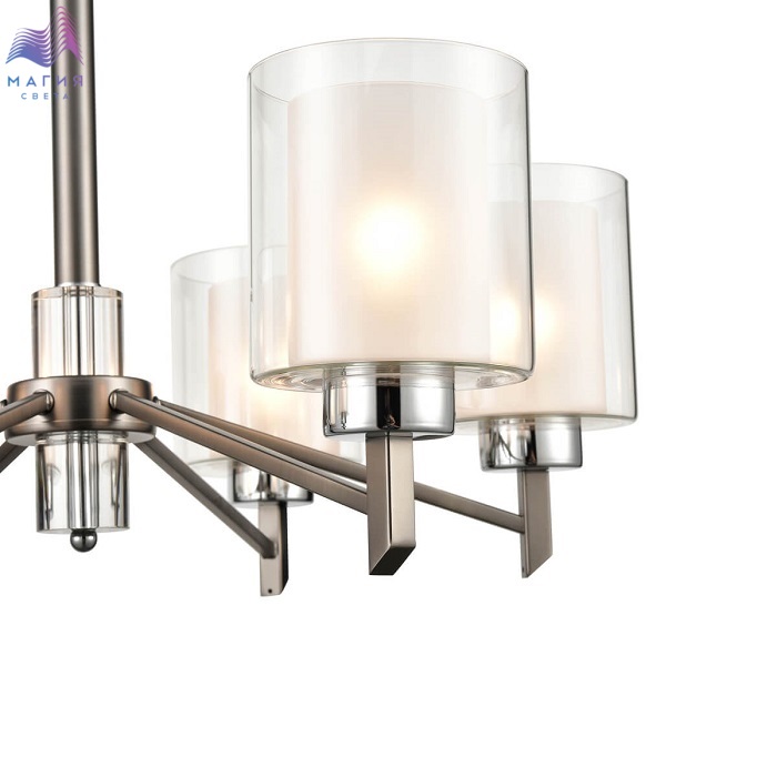Серия Vele Luce Felice представлена подвесной люстрой и бра в серебряном цвете. Плафоны изготовлены из двойного стекла белого и прозрачного цветов. Центральная часть люстры декорирована графичными стеклянными элементами.