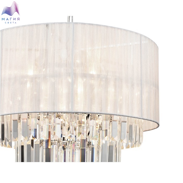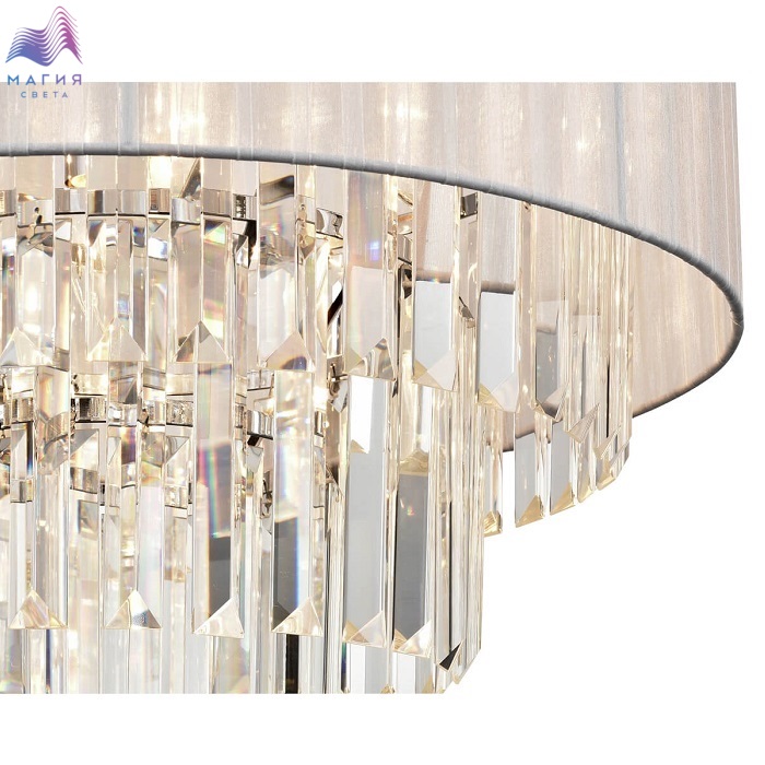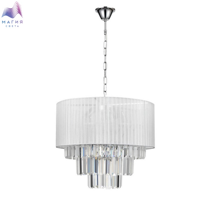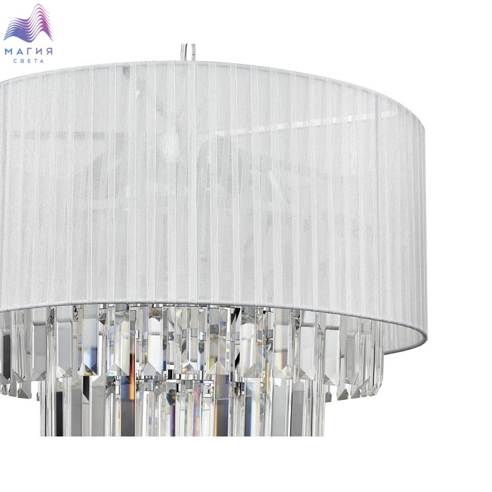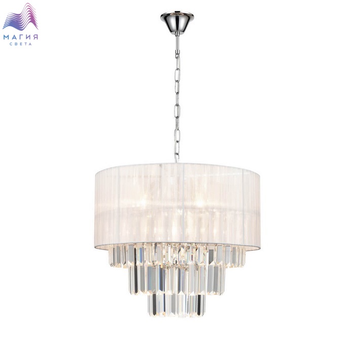 Серия Vele Luce Fata чарует своим дизайном. Плафон изготовлен из текстильной ленты белого цвета, которая обрамляет металлический каркас. Хрустальные подвески расположены в центральной части светильников. Длину цепи у подвесной люстры можно отрегулировать при монтаже.