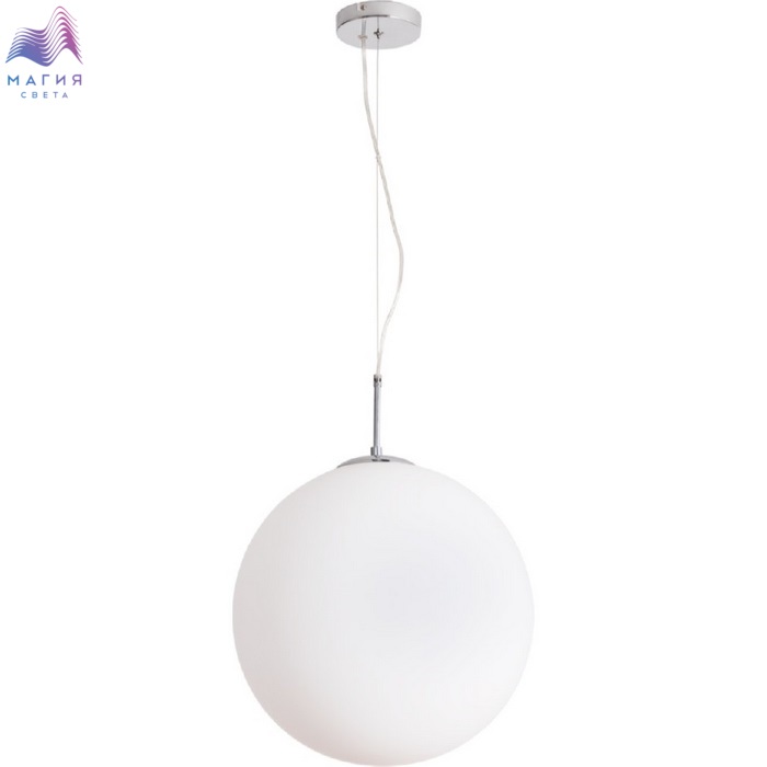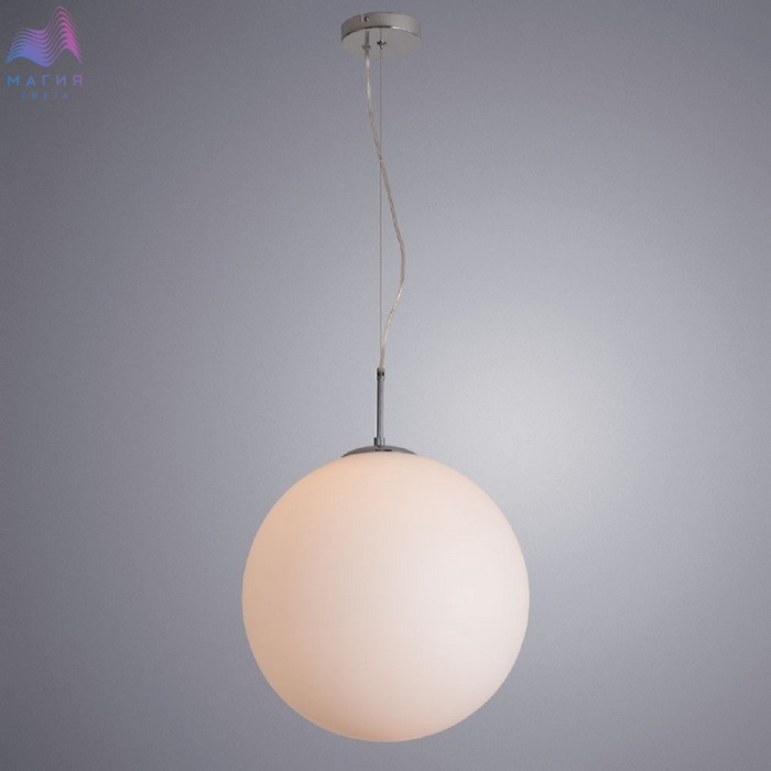 Подвесной светильник Arte Lamp Volare в форме шара. Металлическое основание окрашено в хромированный или бронзовый цвет. Плафон изготовлен из стекла. Длину провода можно отрегулировать при монтаже.