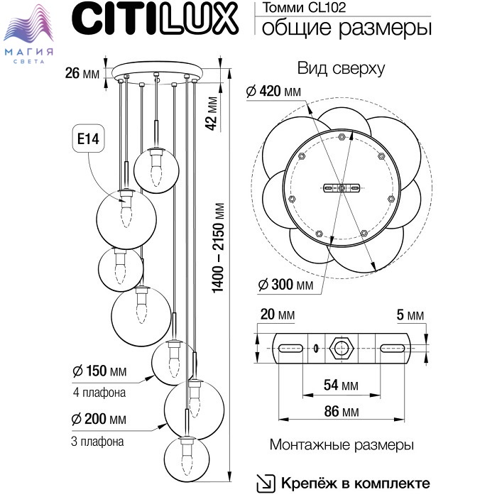 Подвесной светильник Citilux Томми CL102071. Материал: металл/стекло. Цвет: матовый хром/прозрачный. Основание светильника круглой формы. Подвесная спираль каскада сформирована плафонами двух размеров, диаметром 15см и 20см. Плафоны в форме шара.