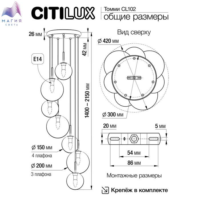 Подвесной светильник Citilux Томми CL102073. Материал: металл/стекло. Цвет: бронза/шампань. Основание светильника круглой формы. Подвесная спираль каскада сформирована плафонами двух размеров, диаметром 15см и 20см. Плафоны в форме шара.