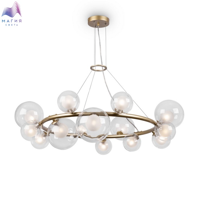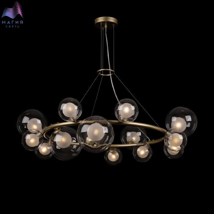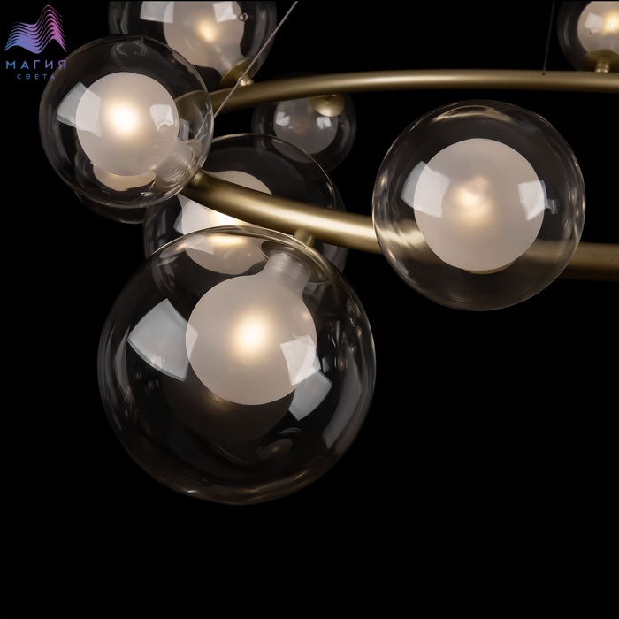 Серия Freya Duo выполнена из металла оттенка матового золота, а двойные плафоны-сферы – из стекла. Внутренняя часть плафона – белого цвета, внешняя – прозрачная. Расположенные вдоль широкой окружности, они обеспечивают равномерное, яркое освещение. Визуальную легкость композиции подчеркивают тонкие, почти невидимые тросы – создается иллюзия трендового «парящего» света. Две подвесные люстры обеспечивают различную интенсивность подсветки – можно выбрать подходящий вариант (из 10 или 14 плафонов) с учетом размеров помещения.