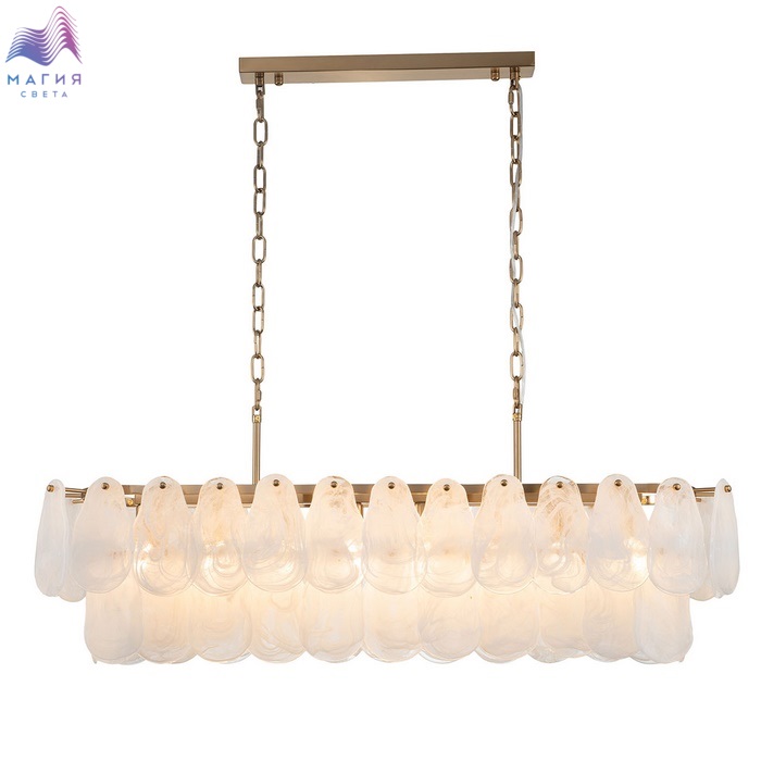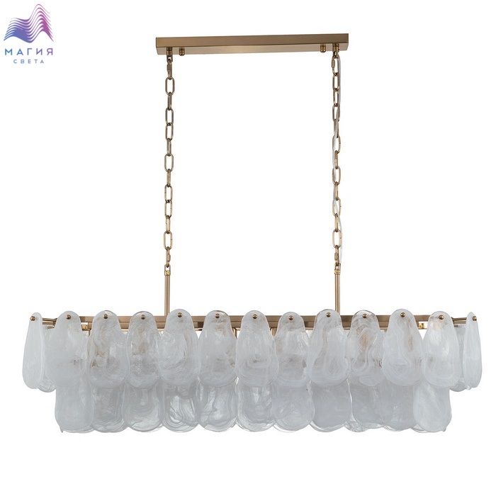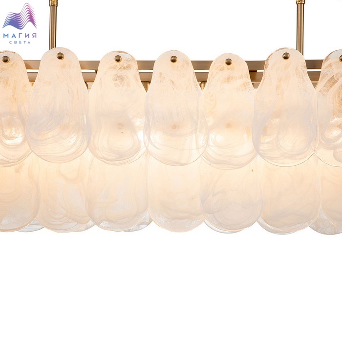 Серия INDIGO Fiocchi исполнена в современном стиле. Металлическая арматура латунного цвета дополнена стеклянными пластинами, похожие на осколки льда. В коллекции представлены 2 варианта подвесных светильников. Длина подвеса регулируется при монтаже.