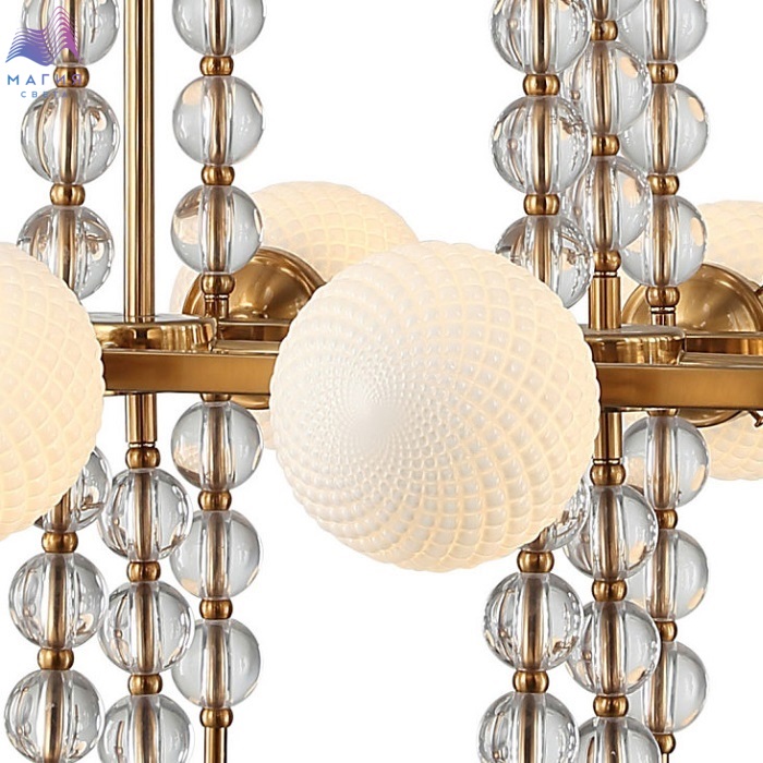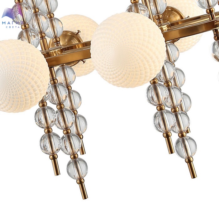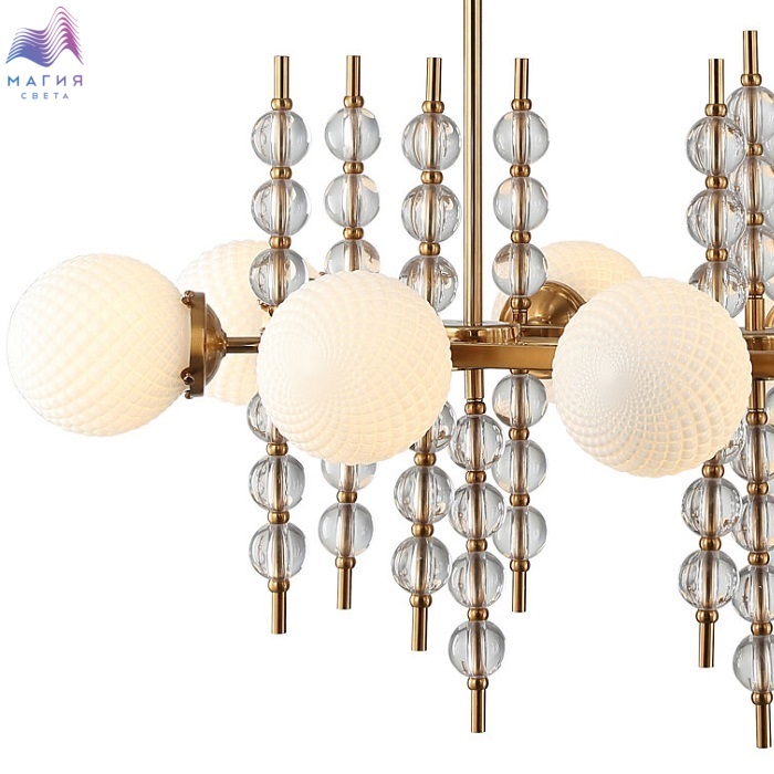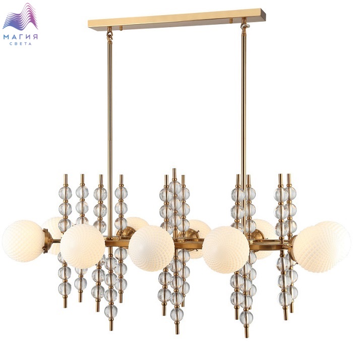 Люстра на штанге 2120/03/10P Stilfort серии Queenly выполена в стиле модерн. Арматура изготовлена из металла в цвете "золото" и украшена декоративными стеклянными элементами. Плафоны люстры выполнены из матового стекла.