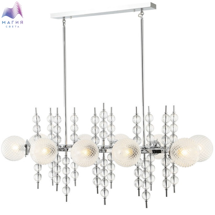 Люстра на штанге 2120/09/10P Stilfort серии Queenly выполнена в стиле модерн. Арматура изготовлена из хромированного металла, украшенного стекланными декоративными элементами. Плафоны люстры выполнены из текстурированного стекла, полностью прозрачные.