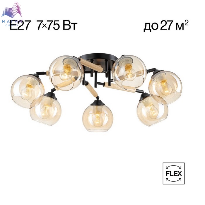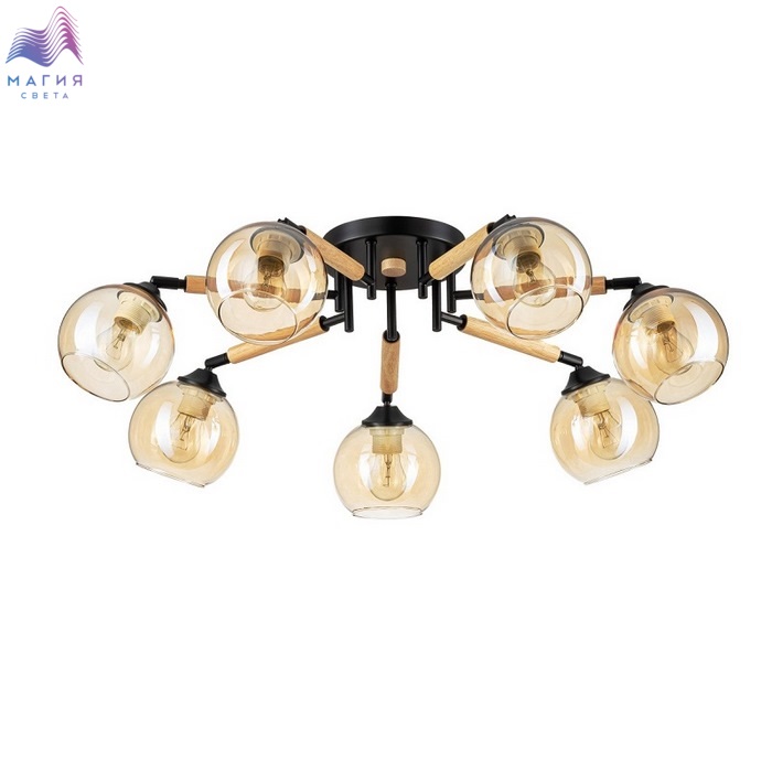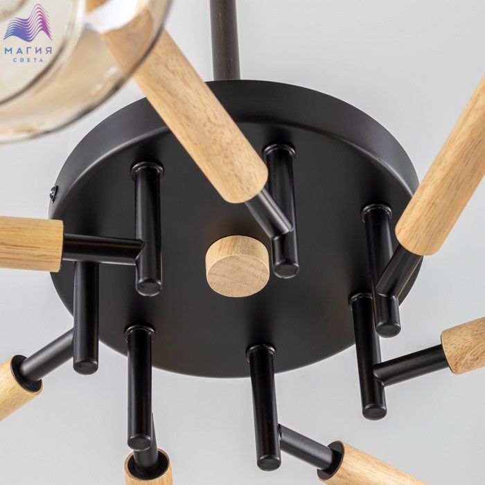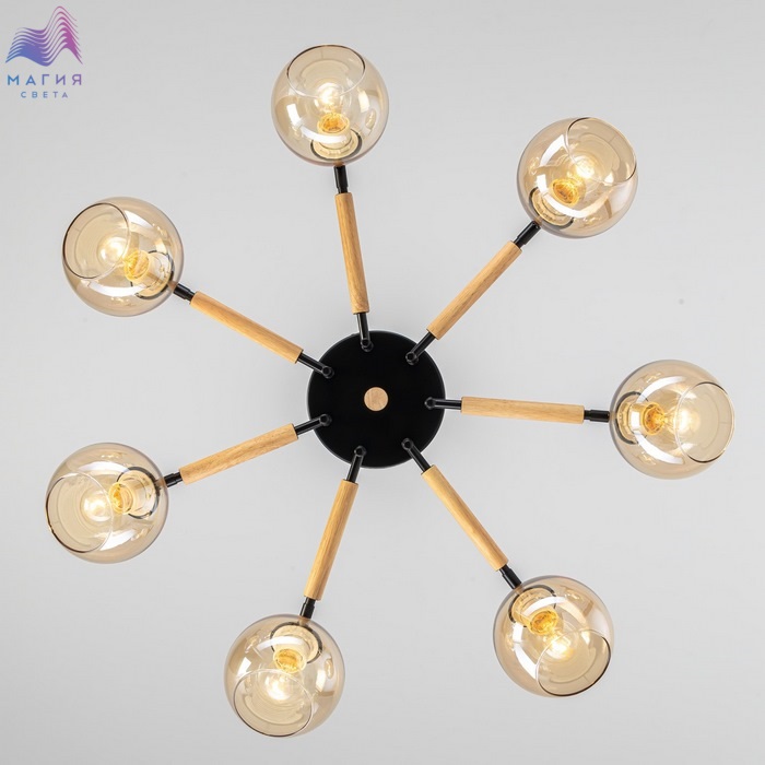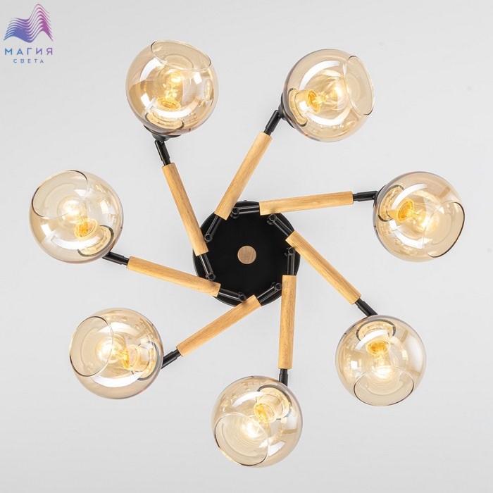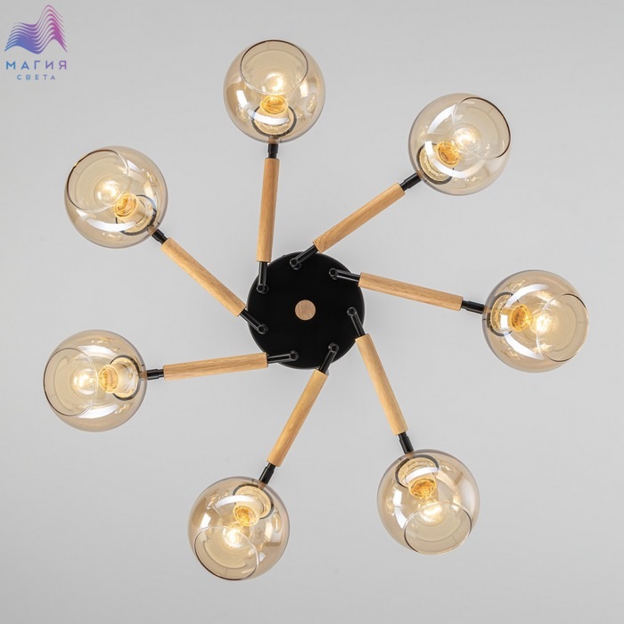 Потолочная люстра Citilux Tika CL133171. Материал: металл/дерево/стекло. Цвет: черный/светлое дерево/янтарный. Поворотные шарниры позволяют направить плафоны в любую сторону, а тип крепления рожков собрать компактную или раскидистую модель.