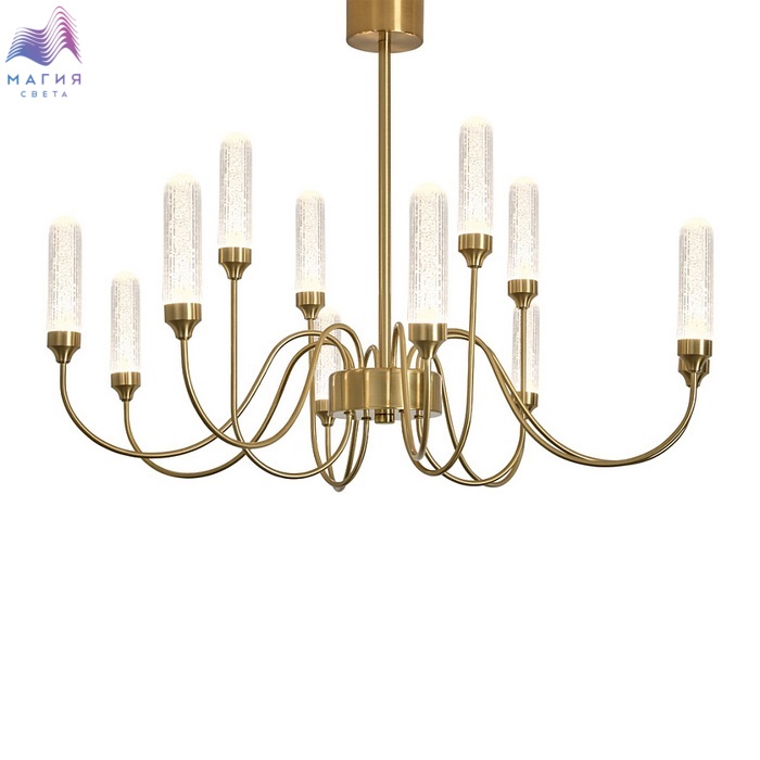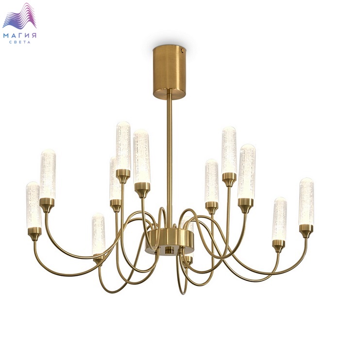Серия Freya Alias состоит из двух вариантов люстр. Цвет металла — латунь и никель. Основной акцент в дизайне сделан на акриловые плафоны с эффектом пузырьков: они мягко рассеивают свет и создают лёгкую игру бликов. В качестве источника света используются встроенные LED-модули.