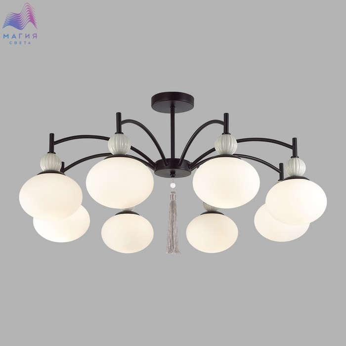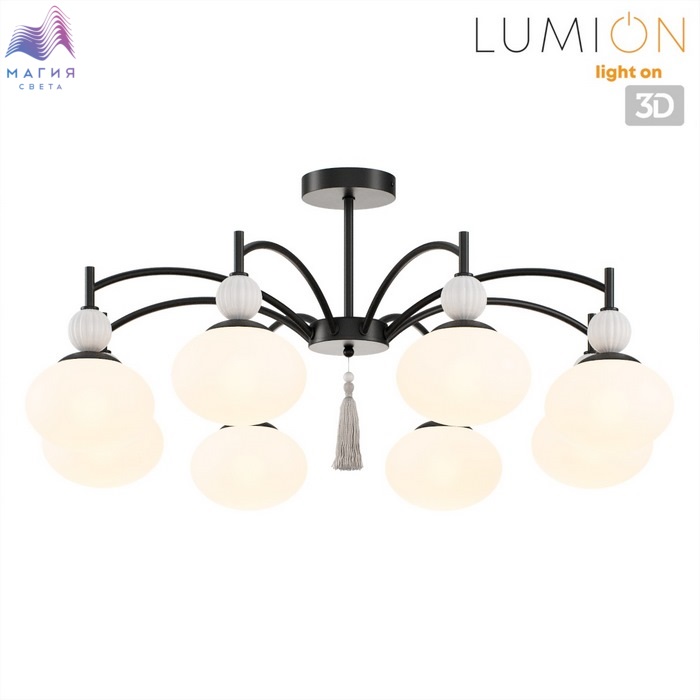 Серия светильников Lumion Gloriya привлекает внимание необычной формой плафонов в виде элипсоида и керамики в виде фактурных шарообразных элементов бежевого или серого цвета. Изящная арматура в латунном или черном цвете объединяет все элементы и венчается шелковой съемной кисью в центре всей композиции.