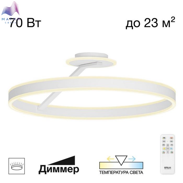 Светодиодный потолочный светильник Citilux Дуэт CL719760. Материал: металл/полимер. Цвет: матовый белый. Плафон в форме кольца. Пульт ДУ в комплекте (плавная регулировка яркости от 10 до 100%; управление цветовой температурой от 3000К до 5500К). Освещаемая площадь - от 12 до 23м².