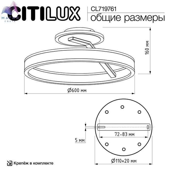 Светодиодный потолочный светильник Citilux Дуэт CL719761. Металл: материал/оптический полимер. Цвет: черный/белый. Пульт ДУ в комплекте (регулировка яркости от 10 до 100%; управление цветовой температурой от 3000К до 5500К). Площадь освещения - от 12 до 23м².
