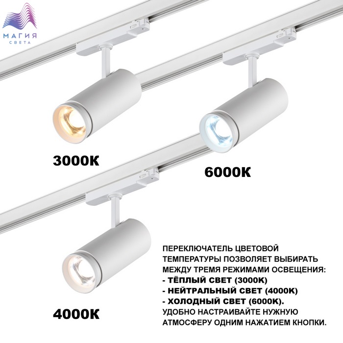 Трековый трехфазный LED-светильник Novotech NAIL. Уникальная система настроек включает смену цветовой температуры (от теплого 3000К, нейтрального 4000К до холодного белого 6000К), регулирование интенсивности света (30 Вт, 35 Вт или 40 Вт) и изменение угла рассеивания (от четких акцентирующих лучей 20° до равномерно распределенных потоков света 50°).