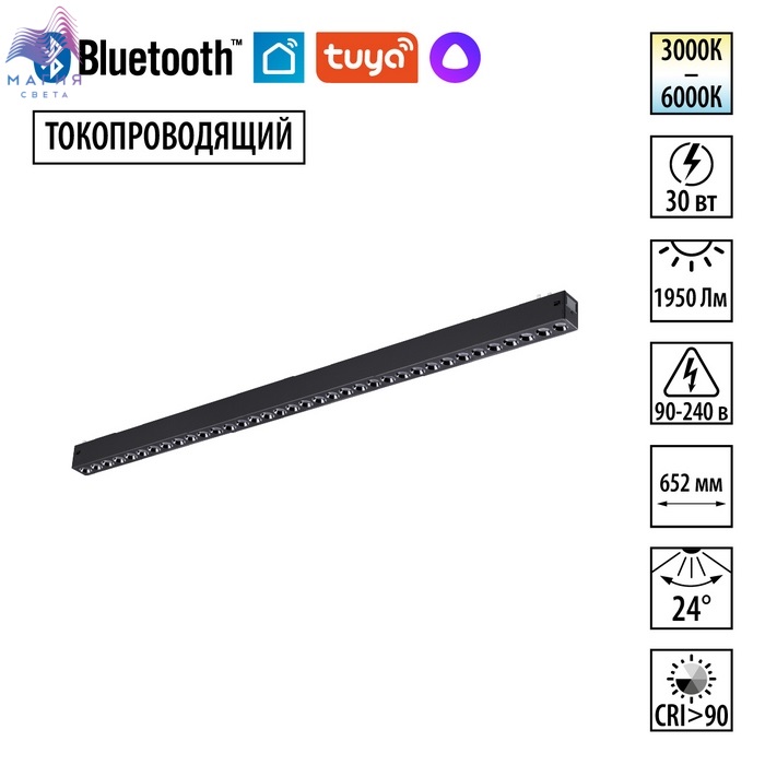 Трековая смарт-система Novotech VECTOR 220В. Система представлена двумя линейками светильников: первая оснащена интеллектуальной системой управления через мобильное приложение, позволяющей менять яркость и цветовую температуру света, вторая — светильники с простым механическим переключателем трех уровней цветовой температуры (3000, 4000, 6000 К).