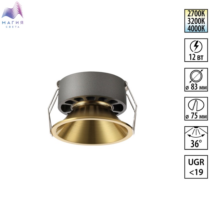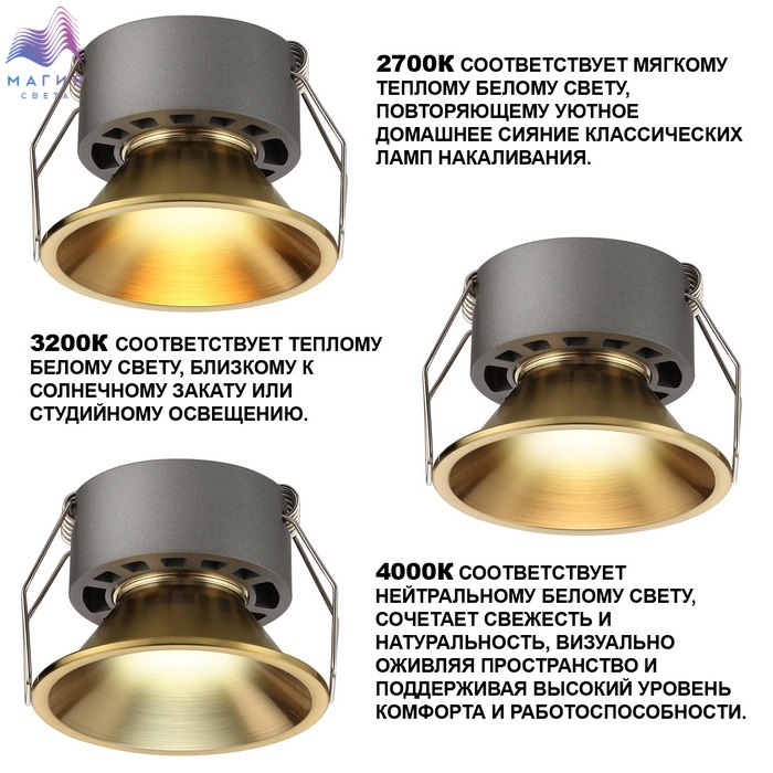 Встраиваемые светильники Novotech NOVA. Можно выбрать оттенок свечения (2700K/3200K/4000K). 3 цвета корпуса: матово-чёрный, матовый белый, брашированная бронза.